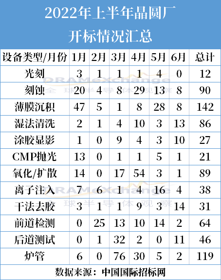 從開(kāi)標(biāo)數(shù)據(jù)看,2022 年上半年國(guó)內(nèi)主要晶圓廠共開(kāi)標(biāo)765臺(tái)工藝設(shè)備,其中清洗設(shè)備86臺(tái),數(shù)量排名第五。