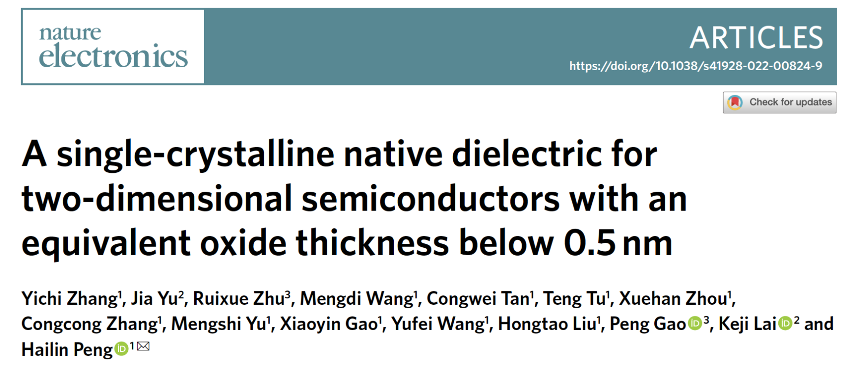 該研究成果于2022年9月15日在線發(fā)表在《自然-電子學》(Nature Electronics 2022, https://doi.org/10.1038/s41928-022-00824-9)。北京大學化學與分子工程學院彭海琳教授為該論文的通訊作者,第一作者為北京大學化學與分子工程學院博士研究生張亦弛。其他主要合作者還包括德州大學奧斯汀分校物理系賴柯吉教授、北京大學物理學院高鵬教授等。Nature Electronics期刊每期會挑選論文邀請作者撰寫研究簡介(Research Briefing),與研究論文同期在線刊出,方便讀者更好地理解重要成果。彭海琳教授和張亦弛同學代表論文作者發(fā)表了題為“Producing ultrathin monocrystalline native oxide dielectrics f2D transistors(為二維晶體管制備超薄單晶自然氧化物介電層)”的研究簡介,簡要介紹了此項研究的背景、過程、發(fā)現和意義。