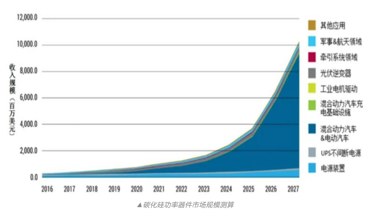 碳化硅具有寬的禁帶寬度、高擊穿電場(chǎng)、高熱傳導(dǎo)率和高電子飽和速率的物理性能,使其有耐高溫、耐高壓、高頻、大功率、抗輻射等優(yōu)點(diǎn),可降低下游產(chǎn)品能耗、減少終端體積,突破了硅基功率半導(dǎo)體器件在大電壓、高功率和高溫度方面的限制所導(dǎo)致的系統(tǒng)局限性。根據(jù)Wolfspeed官方提供的數(shù)據(jù),相同規(guī)格的碳化硅基MOSFET尺寸僅為硅基MOSFET的十分之一。碳化硅在新能源汽車(chē)上的應(yīng)用將在保證汽車(chē)的強(qiáng)度和安全性能的前提下大大減輕汽車(chē)的重量,有效提升電動(dòng)車(chē)10%以上的續(xù)航里程,減少80%的電控系統(tǒng)體積。每輛新能源汽車(chē)使用的功率器件價(jià)值約700-1000美元。