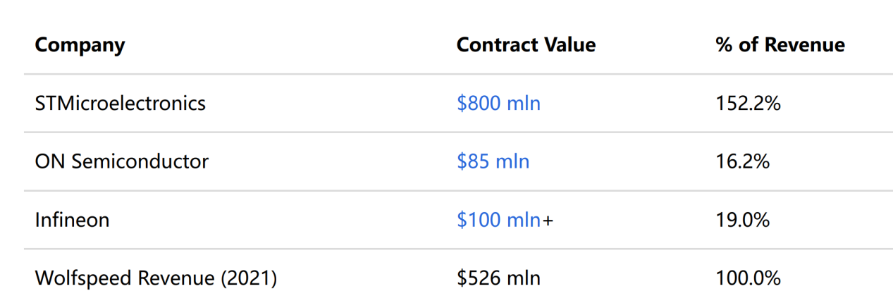 目前Wolfspeed是SiC晶圓市場(chǎng)的領(lǐng)導(dǎo)者,其市場(chǎng)份額為62%,其次是II-VI(IIVI)、SiCrystal和SK siltron。Wolfspeed與安森美、意法半導(dǎo)體和英飛凌簽訂了多份供貨協(xié)議,根據(jù)其年度報(bào)告,2021年意法半導(dǎo)體訂單占其收入的18%,雙方有超過(guò)8億美元的長(zhǎng)期晶圓供應(yīng)協(xié)議,如果僅算合同金額,意法半導(dǎo)體的這份合同(按照年均攤)是其年平均營(yíng)收1.53倍,如下圖: