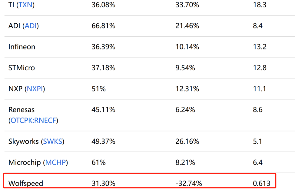 此外,IDM商業(yè)模式是領(lǐng)先碳化硅晶圓制造商通行的設(shè)備供應(yīng)模式,在這些IDM中,Wolfspeed的毛利率和凈利率幾乎是最低的: